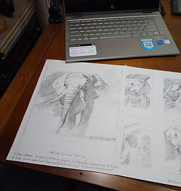 These are progress pics of a bull African elephant called Mabu. Its done in oils on a 30 x 40 inch gallery wrapped canvas. These images show in part what some of the sketches I create while visualizing the composition. You can view the finished piece in my original art page.